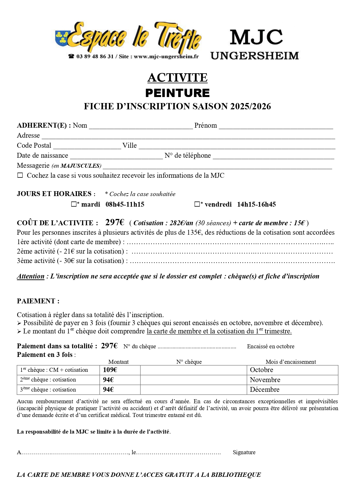 • Tarifs dégressifs en cas d’inscription à plusieurs activités. Se référer dans infos pratiques.