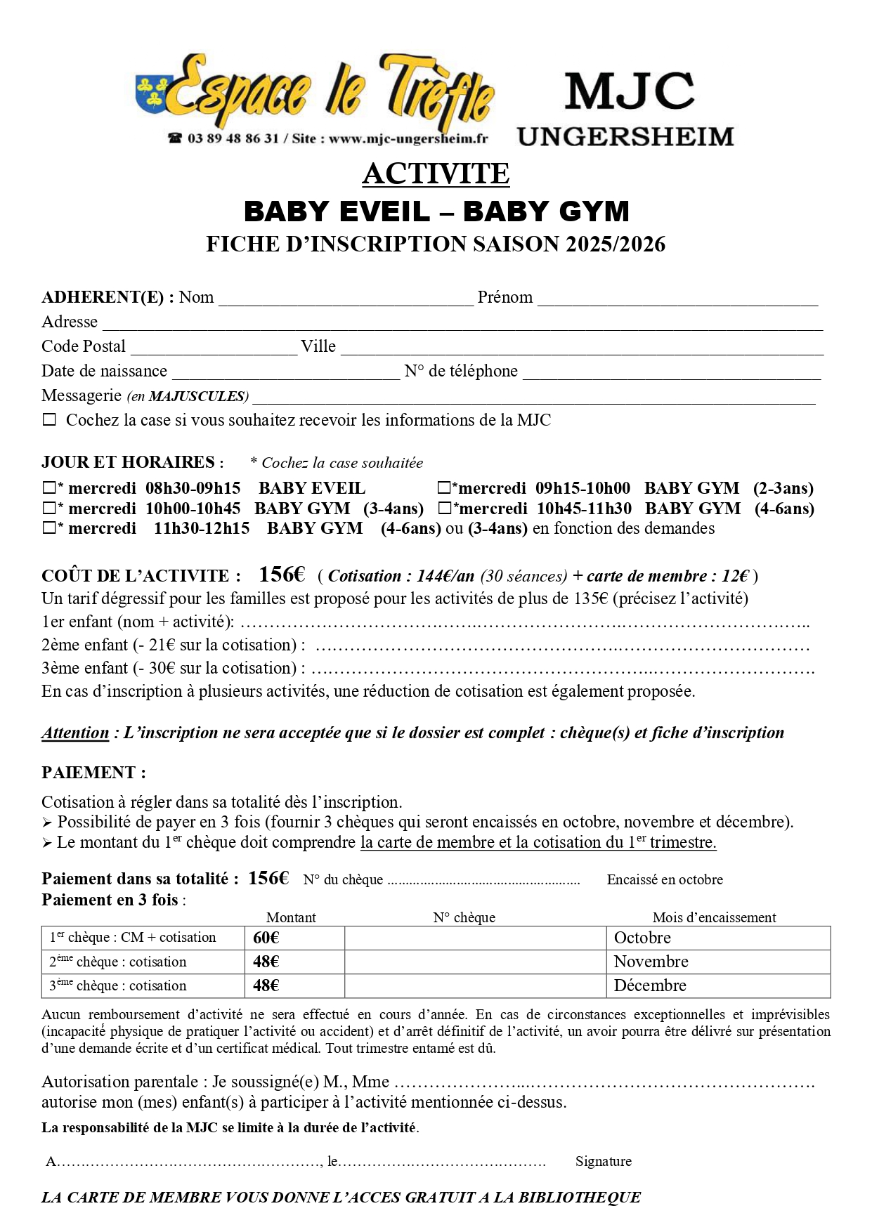 Avant tout ludique et éducatif, les ateliers contribuent au développement harmonieux des enfants sur le plan psychomoteur et physique. Grâce à l’aménagement et la mise en place de parcours, l’enfant évoluera sur différents ateliers (rotation, équilibre…). Le baby-gym donne une meilleure aisance corporelle et bien du plaisir.