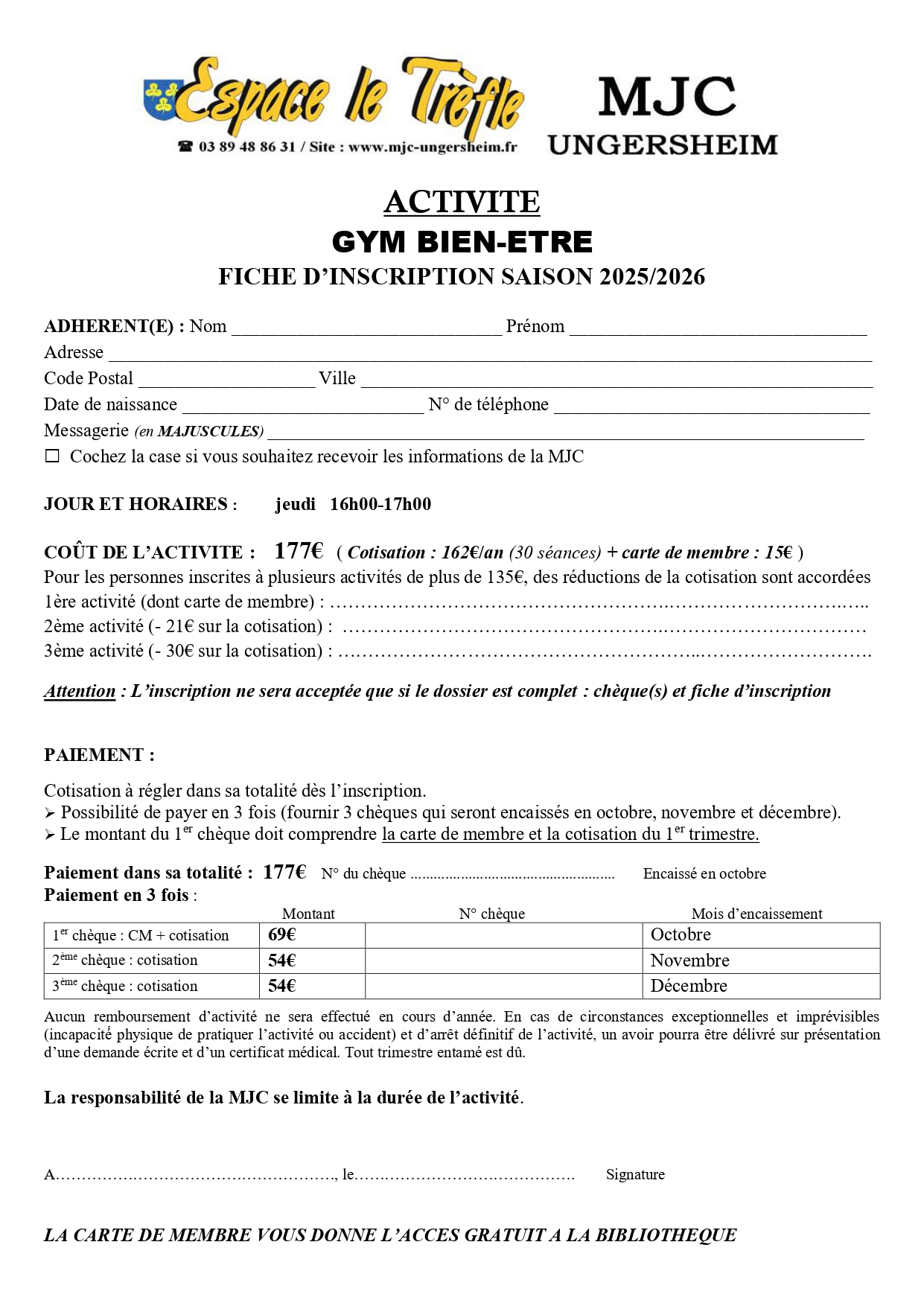 Cette méthode de renforcement (avec du petit matériel) sollicite les muscles profonds et permet une amélioration de la posture, de la souplesse et de l’équilibre … fonctions toutes nécessaires au bien être quotidien. Une belle posture, une silhouette affinée, un corps tonique et souple : voilà l’objectif de la méthode Pilates. (Prévoir : une tenue souple et un tapis de sol).