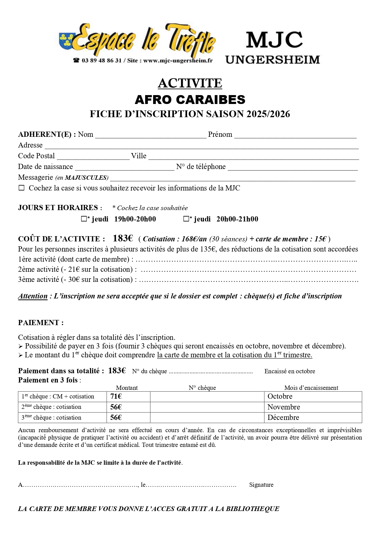 Partez à la découverte des rythmes et danses Afro Antillaises un pur voyage musical et dansé ! La fusion des rythmes antillais et africains est source de créativité. Elle permet de prendre connaissance de son corps, de l’harmonie du geste et de découvrir de nouvelles formes de liberté et d’expressions corporelles.Chorégraphies colorées, métissées et épicées. Découvrez les danses traditionnelles des caraïbes, le zouk et la danse africaine.